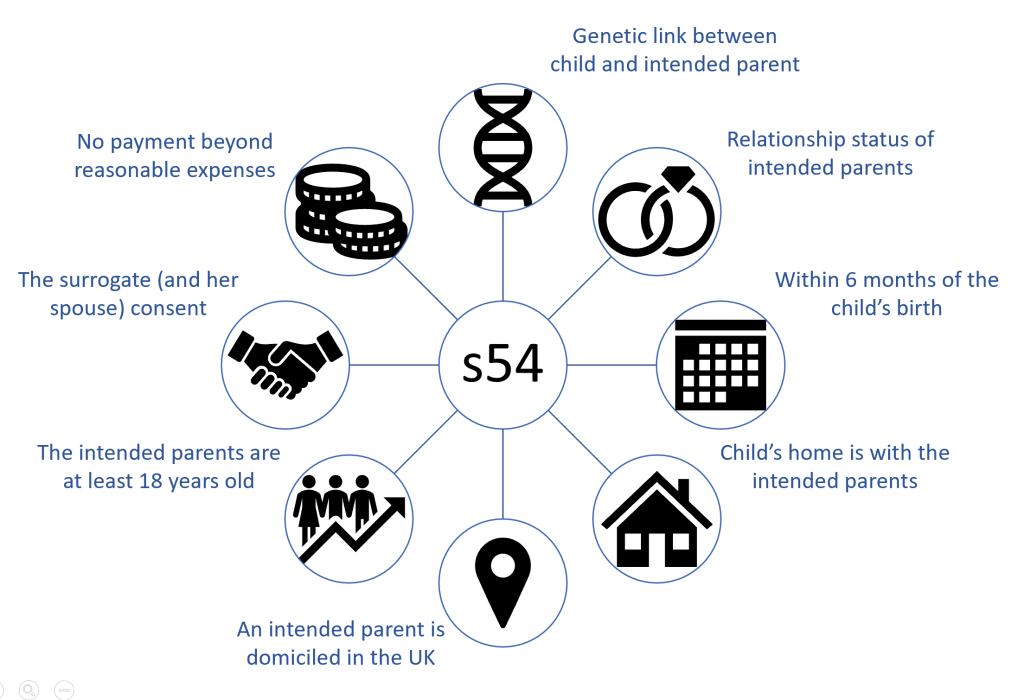 In order for the court to be able to grant a parental order, the statutory requirements contained within s54 Human Fertilisation and Embryology Act 2008 need to be met. Since 2019, a single intended parent has also been able to apply for legal parenthood, with the requirements contained within s54A. Alongside these requirements, the court also has an obligation to ensure that the decision will meet the lifelong welfare needs of the child.