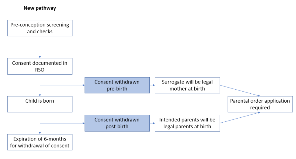 Under the recommended new pathway, the intended parents would be the child’s legal parents from birth, provided that the surrogate has not withdrawn her consent to the arrangement.