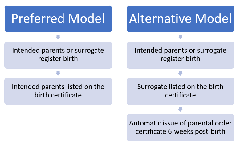 In the 2019 Consultation Paper, the ‘Preferred Model’ was put forward as a provisional proposal. This model would operate so that the intended parents could register the child’s birth and be named as the parents on the birth certificate.