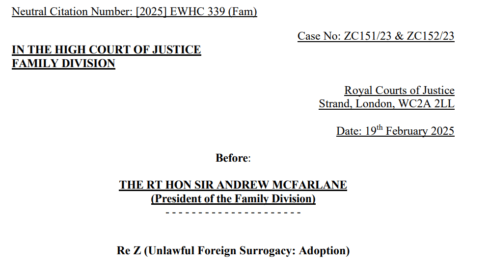 In the concluding paragraph of the Re Z judgment, Sir Andrew Macfarlane issued a strong warning that individuals who consider entering a commercial foreign surrogacy arrangement should be prepared for the court to refuse an adoption or parental order,