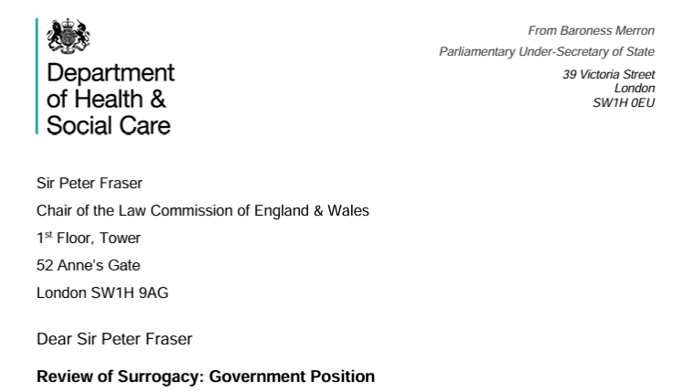On 10th April 2025, the Parliamentary Under Secretary of State for the Department of Health and Social Care sent a letter to the Law Commissions. Falling short of a final response, which was anticipated within 12 months of the Full Report and Draft Bill being published, the letter explains that the Government is not currently in a position to prioritise surrogacy reform. As such, there was an explicit statement that the Government did not intend to put forward the proposals at this time. A final government response is still awaited.